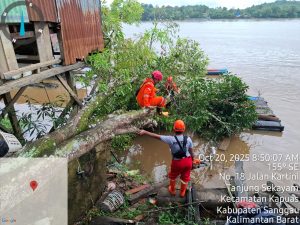 RESPONS CEPAT TIM PUSDALOPS BPBD KABUPATEN SANGGAU TANGANI POHON TUMBANG AKIBAT HUJAN DERAS
